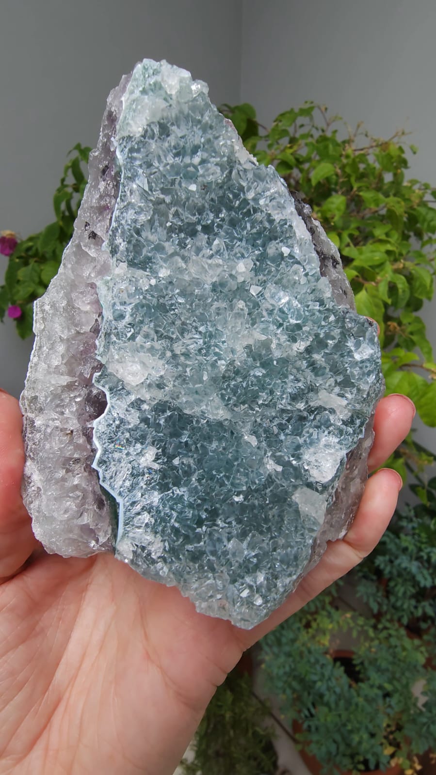 Drusas em alquimia rara coroadas pelo violeta sagrado da Ametista e sobre ela, como um véu verde, repousa a suave presença da Celadonita. Selando essa obra da natureza, centenas de microcristais hialinos florescem no topo, fragmentos de Quartzo puro capturando e expandindo a luz ✨