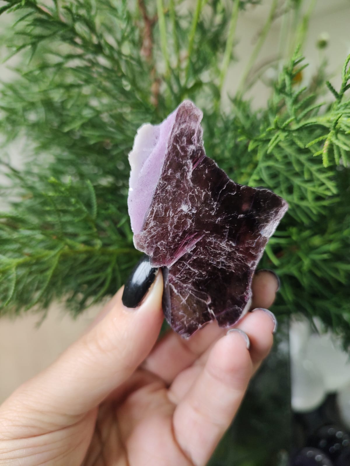 A Lepidolita apresenta a mistura do rosa (coração) com o roxo (mente).