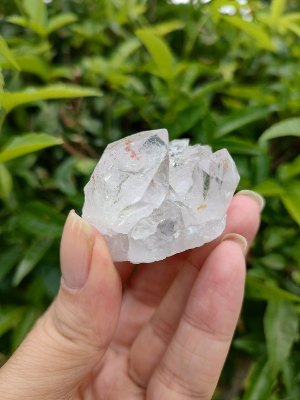 Cristais de Quartzo Translucido que na sua formação receberam Hematita (tons vermelho, laranja e amarelo) que estão dentro das peças, desta forma com todo o poder da Hematita amplificado pelo Quartzo.