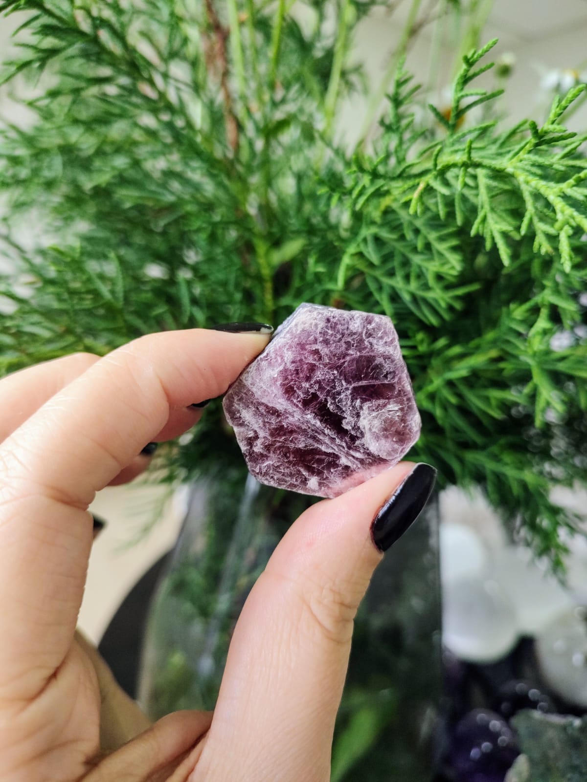 A Lepidolita apresenta a mistura do rosa (coração) com o roxo (mente).