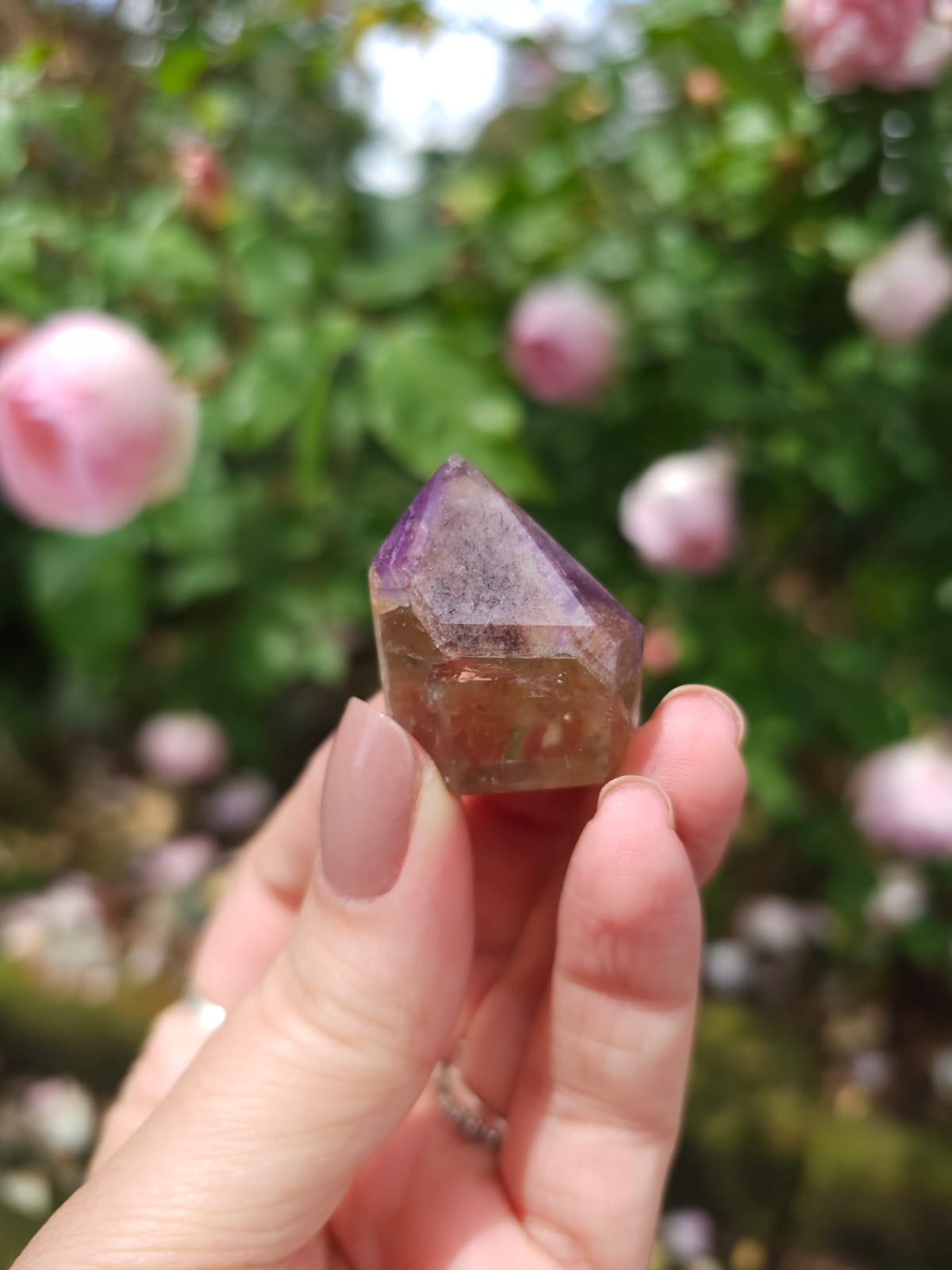 Uma mistura de cristais incluindo de forma alternada Fumê, Citrino e Quartzo Incolor, recebendo uma capa de Ametista gerando uma energia de altíssima vibração✨