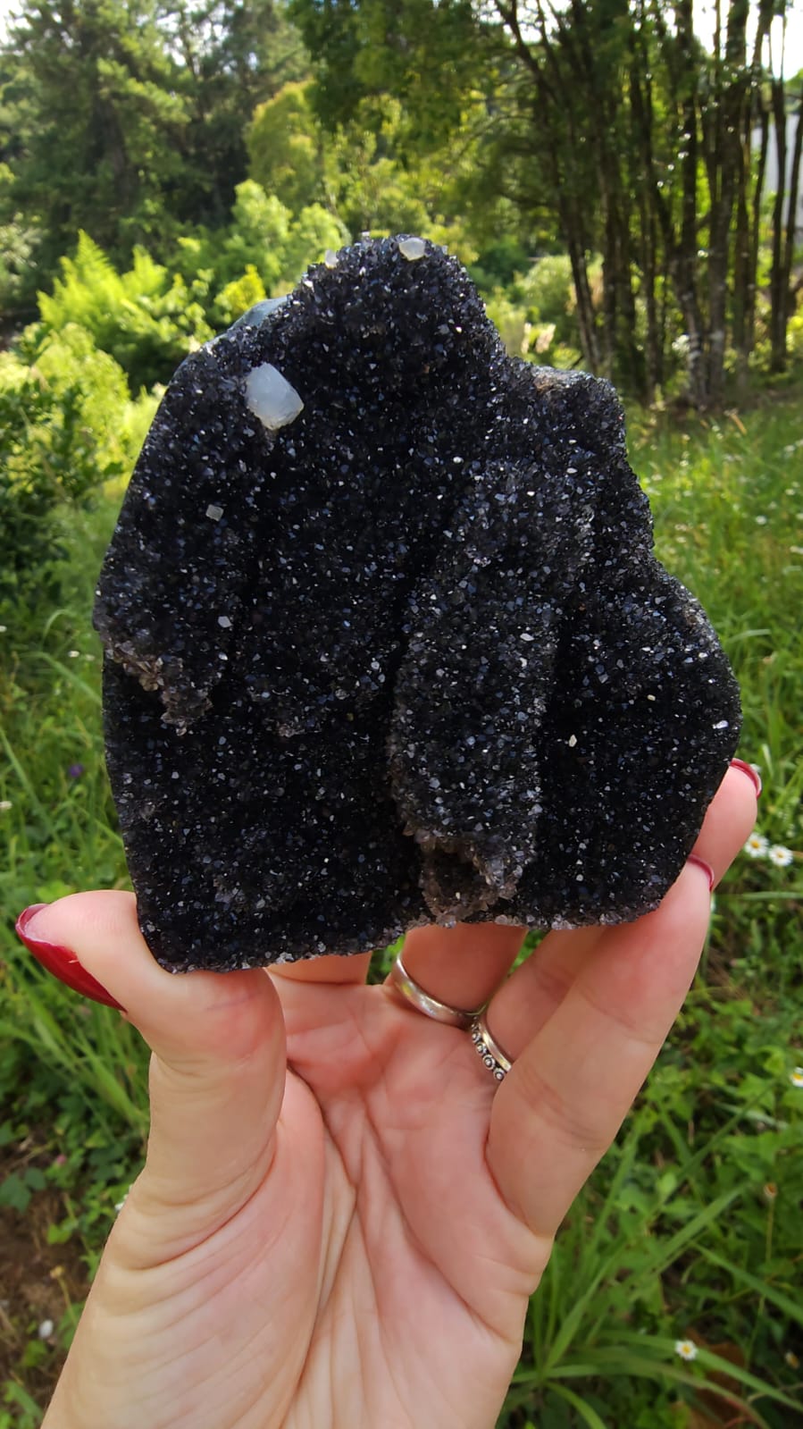Como se guardasse pequenas estrelas presas em sua profundidade, uma intensa Calcedônia Negra lembrando uma galáxia ✨️