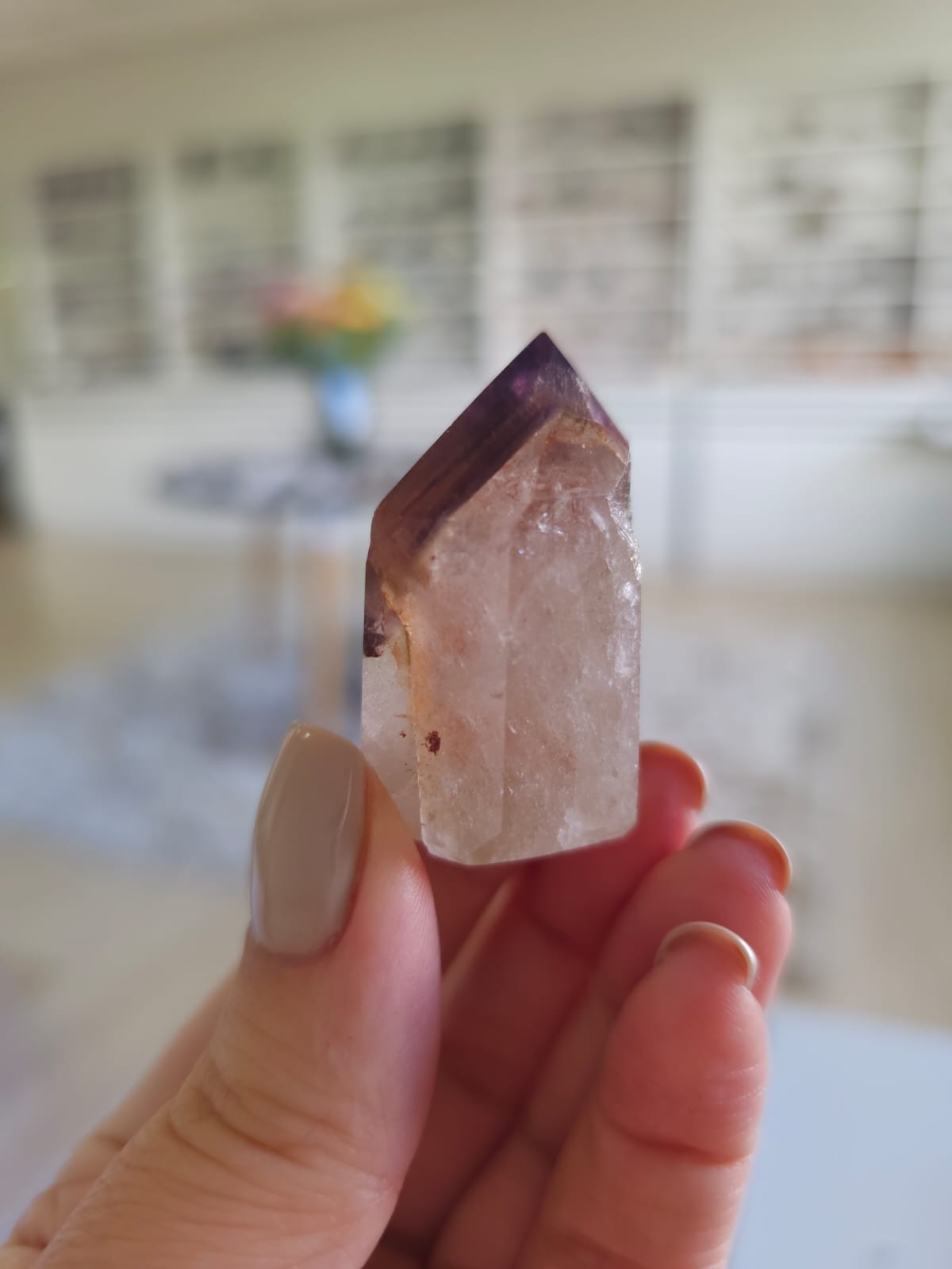 Uma mistura de cristais incluindo Fumê, Citrino e Quartzo Incolor, recebendo uma capa de Ametista gerando uma energia de altissima vibração.