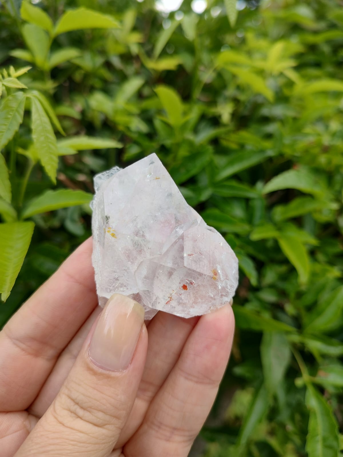 Cristais de Quartzo Translucido que na sua formação receberam Hematita (tons vermelho, laranja e amarelo) que estão dentro das peças, desta forma com todo o poder da Hematita amplificado pelo Quartzo.