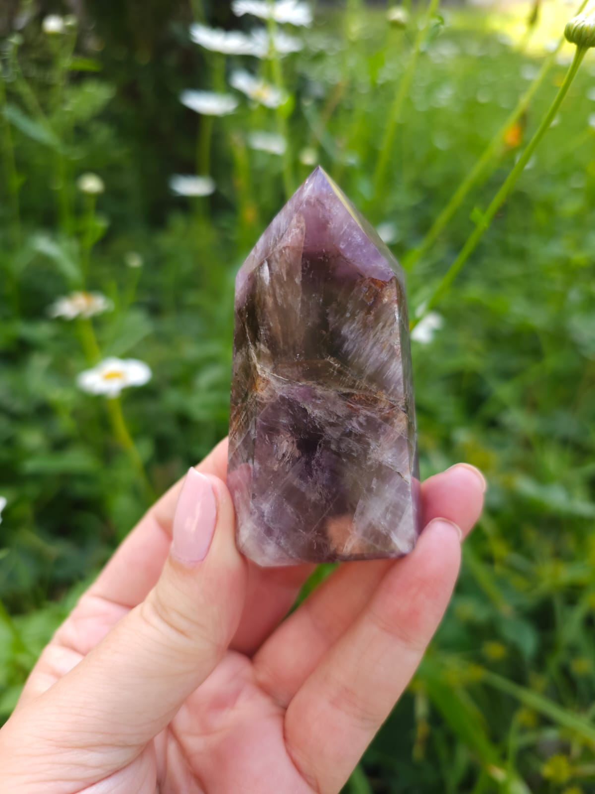 Ele possui as energias de até sete minerais, o que lhe confere um grande poder e uma altíssima vibração: Ametista, Quartzo Fumê, Quartzo com Rutilo, Goethita, Lepidocrocita, Quartzo e Cacoxenita são minerais que constumam compor essa formação✨