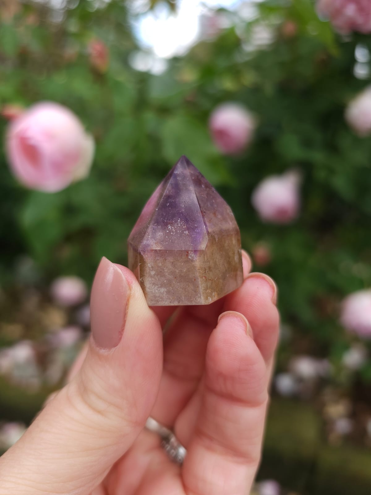 Uma mistura de cristais incluindo de forma alternada Fumê, Citrino e Quartzo Incolor, recebendo uma capa de Ametista gerando uma energia de altíssima vibração✨