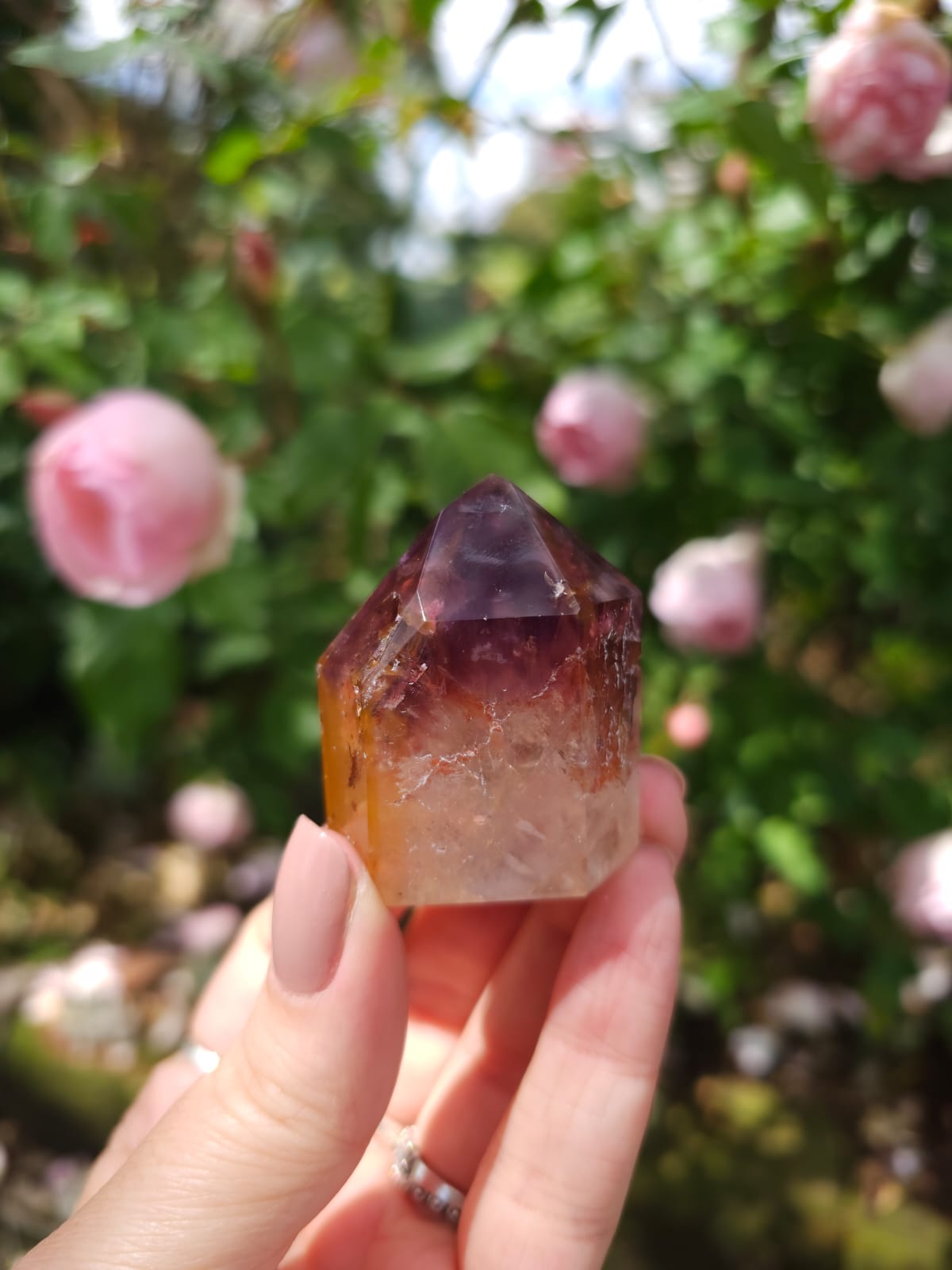 Uma mistura de cristais incluindo de forma alternada Fumê, Citrino e Quartzo Incolor, recebendo uma capa de Ametista gerando uma energia de altíssima vibração✨