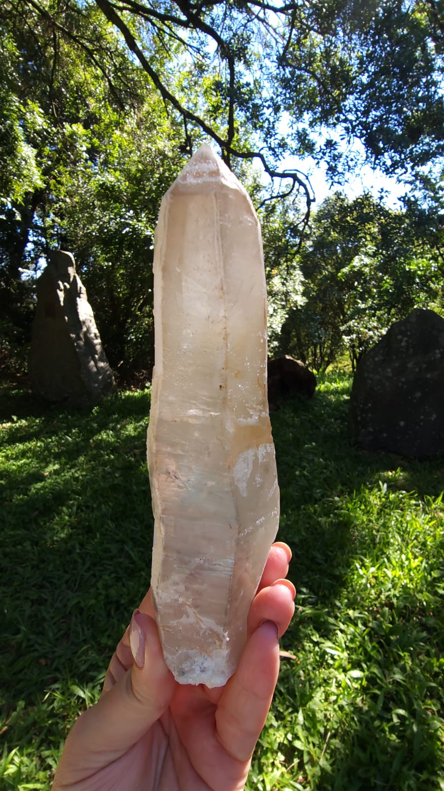 Nas fotos/vídeo um luminoso Agente de Cura Dourado em formação totalmente natural com rutilos, duplamente terminado com marcas Lemurianas, Elo do Tempo Passado e partes do seu corpo cobertas de açúcar cristalino ✨