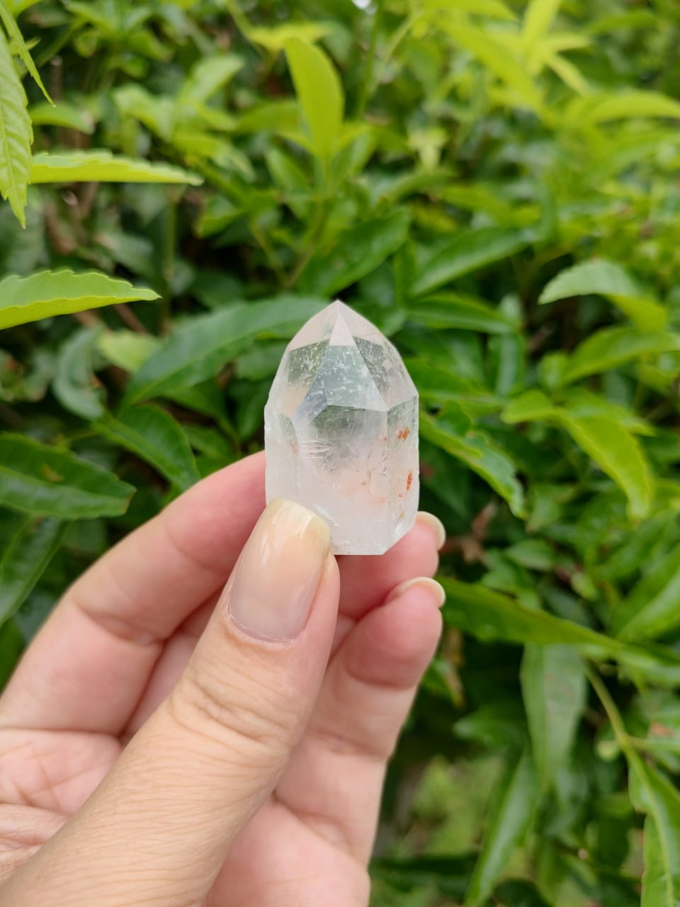Cristais de Quartzo Translucido que na sua formação receberam Hematita (tons vermelho, laranja e amarelo) que estão dentro das peças, desta forma com todo o poder da Hematita amplificado pelo Quartzo.