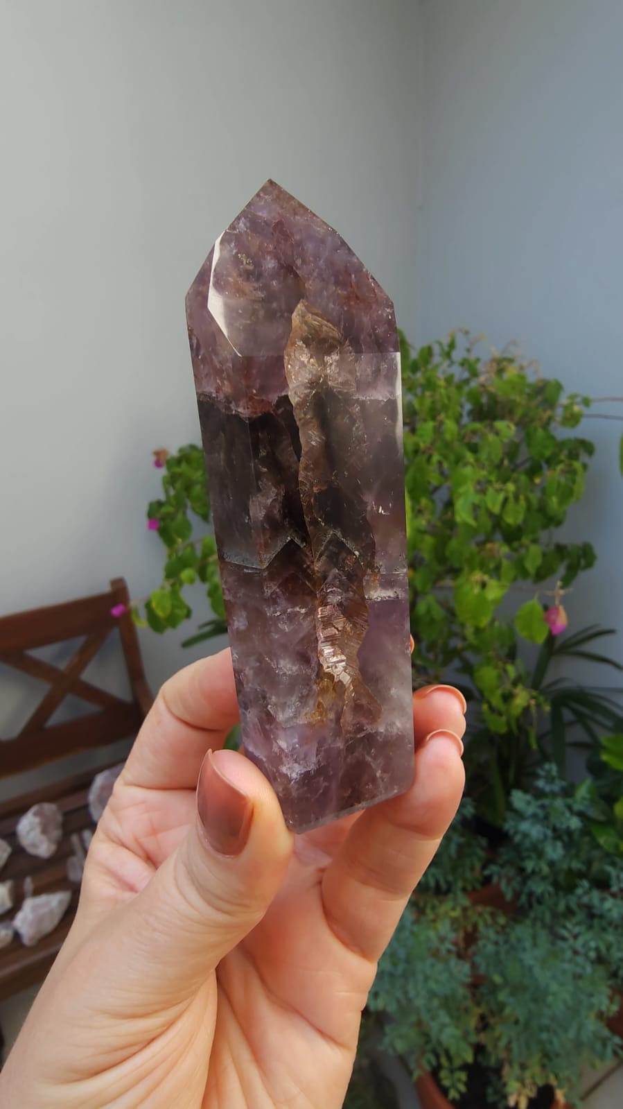 Ele possui as energias de até sete minerais, o que lhe confere um grande poder e uma altíssima vibração: Ametista, Quartzo Fumê, Quartzo com Rutilo, Goethita, Lepidocrocita, Quartzo e Cacoxenita são minerais que constumam compor essa formação✨