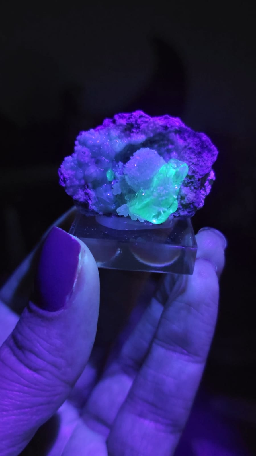 A fluorescência é resultado de íons de uranila, um composto de urânio, excitados pela luz ultravioleta, produzem uma cor verde marcante✨️