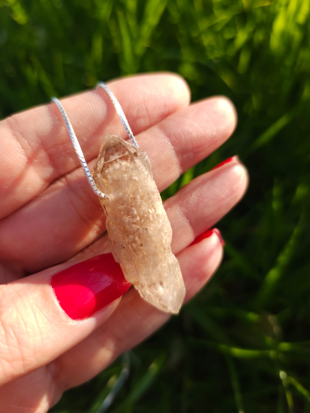 Porém neste amuleto além da ponta geradora estar na direção superior ele é biterminado e a ponta simples de baixo, estabiliza a nossa energia, promove aterramento e nos ajuda a materializar nossos desejos, com o reforço energético dada pelas inclusões de Lodolita da pedra ✨️