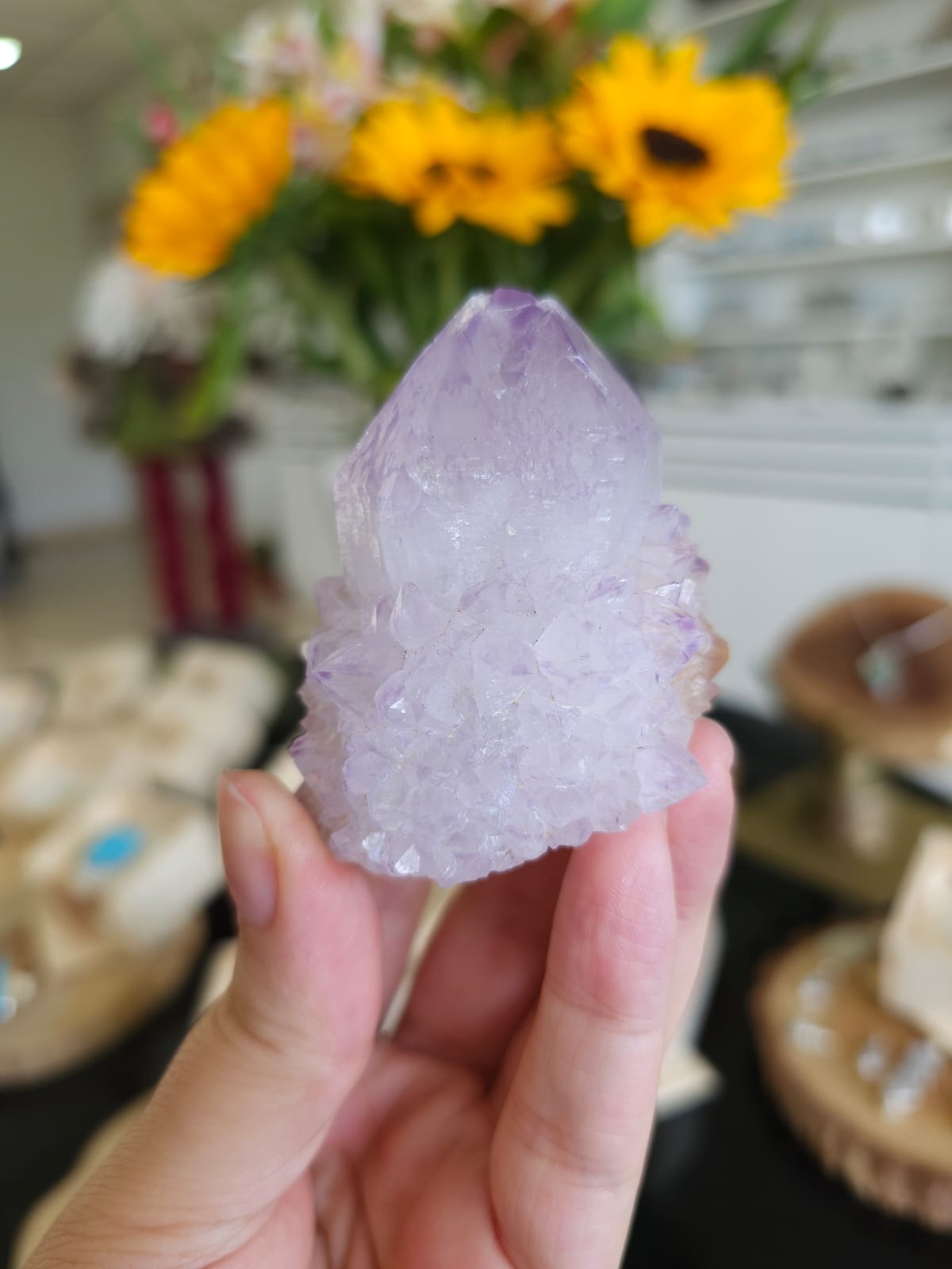 Conhecida também como Ametista Cactus, sua característica que a identifica é um corpo de cristal maior com várias mini pontas grudadas, também formando drusas.