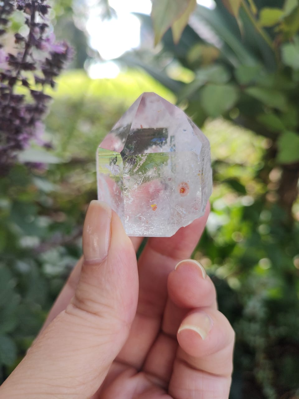 Cristais de Quartzo Translucido que na sua formação receberam Hematita (tons vermelho, laranja e amarelo) que estão dentro das peças, desta forma com todo o poder da Hematita amplificado pelo Quartzo.