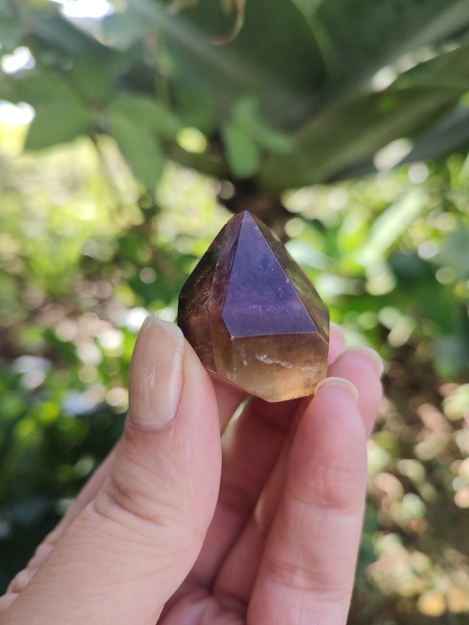 Uma mistura de cristais incluindo Fumê, Citrino e Quartzo Incolor, recebendo uma capa de Ametista gerando uma energia de altissima vibração.