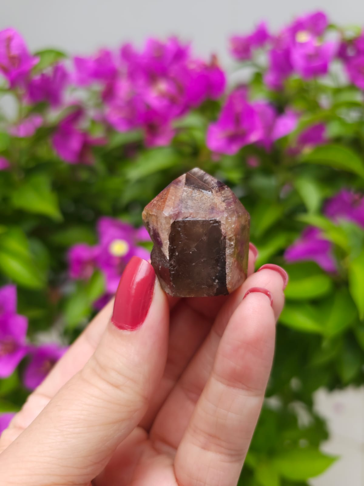 Uma mistura de cristais incluindo Fumê, Citrino e Quartzo Incolor, recebendo uma capa de Ametista gerando uma energia de altissima vibração.