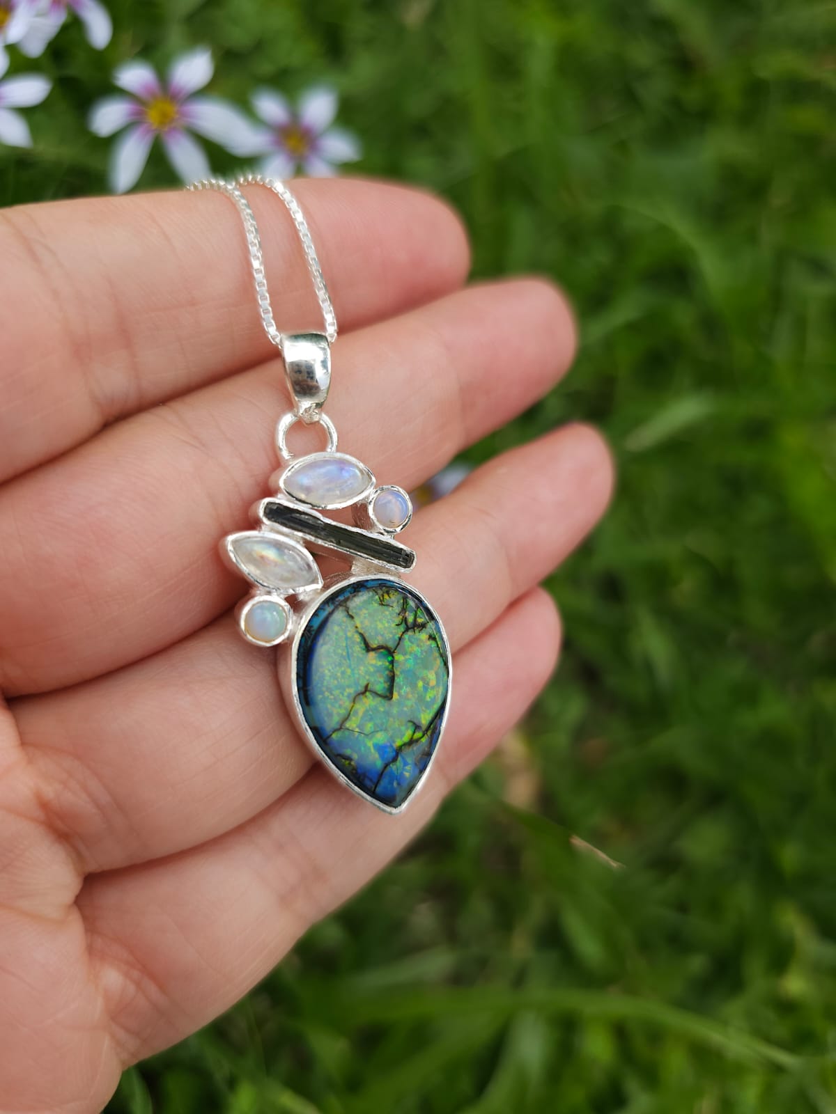 Na joia temos Opala, Turmalina Verde e Pedra da Lua.