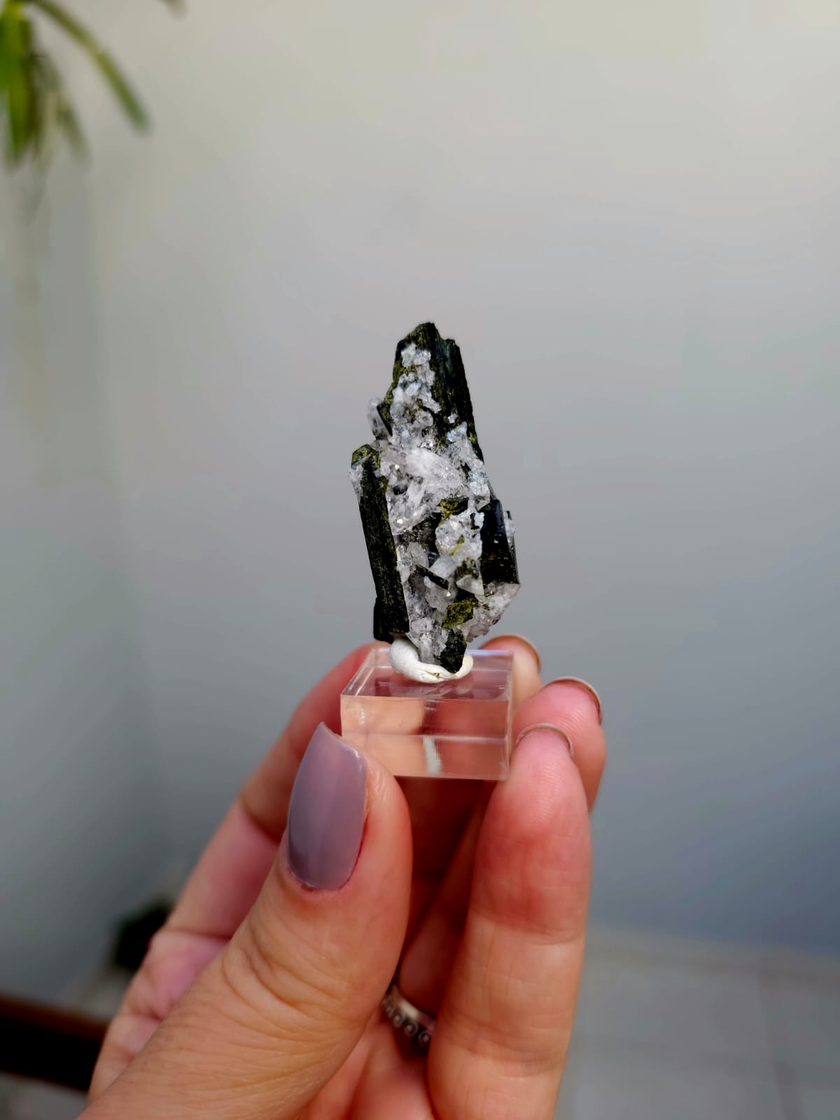Nesta formação Epidoto está coberto de Quartzo em Drusa, nesta alquimia o Quartzo é um grande amplificador da energia do Epidoto, principalmente pelo fato de estar em Drusa ✨