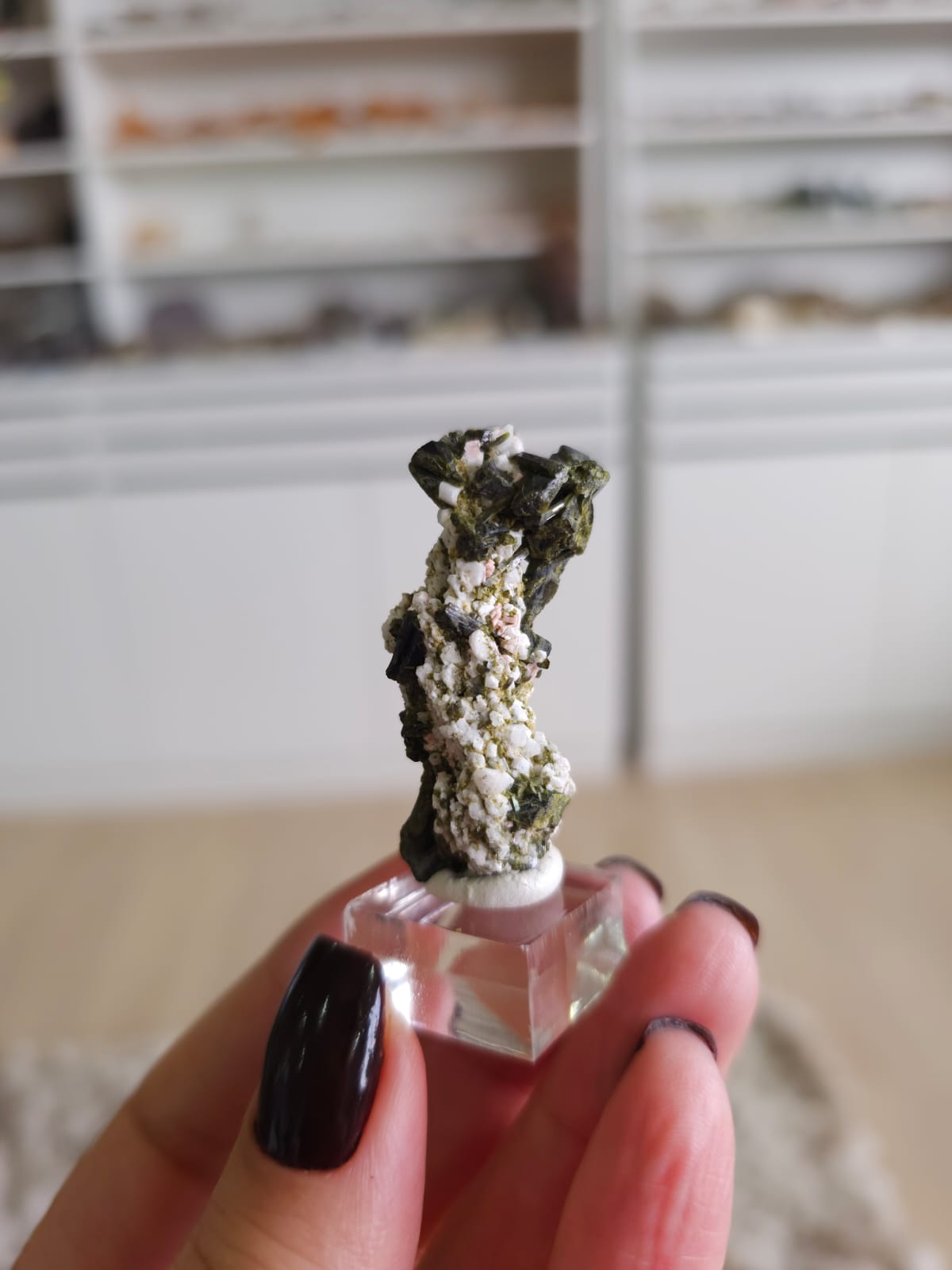 Nesta formação Epidoto está coberto de Quartzo em Drusa, nesta alquimia o Quartzo é um grande amplificador da energia do Epidoto, principalmente pelo fato de estar em Drusa ✨