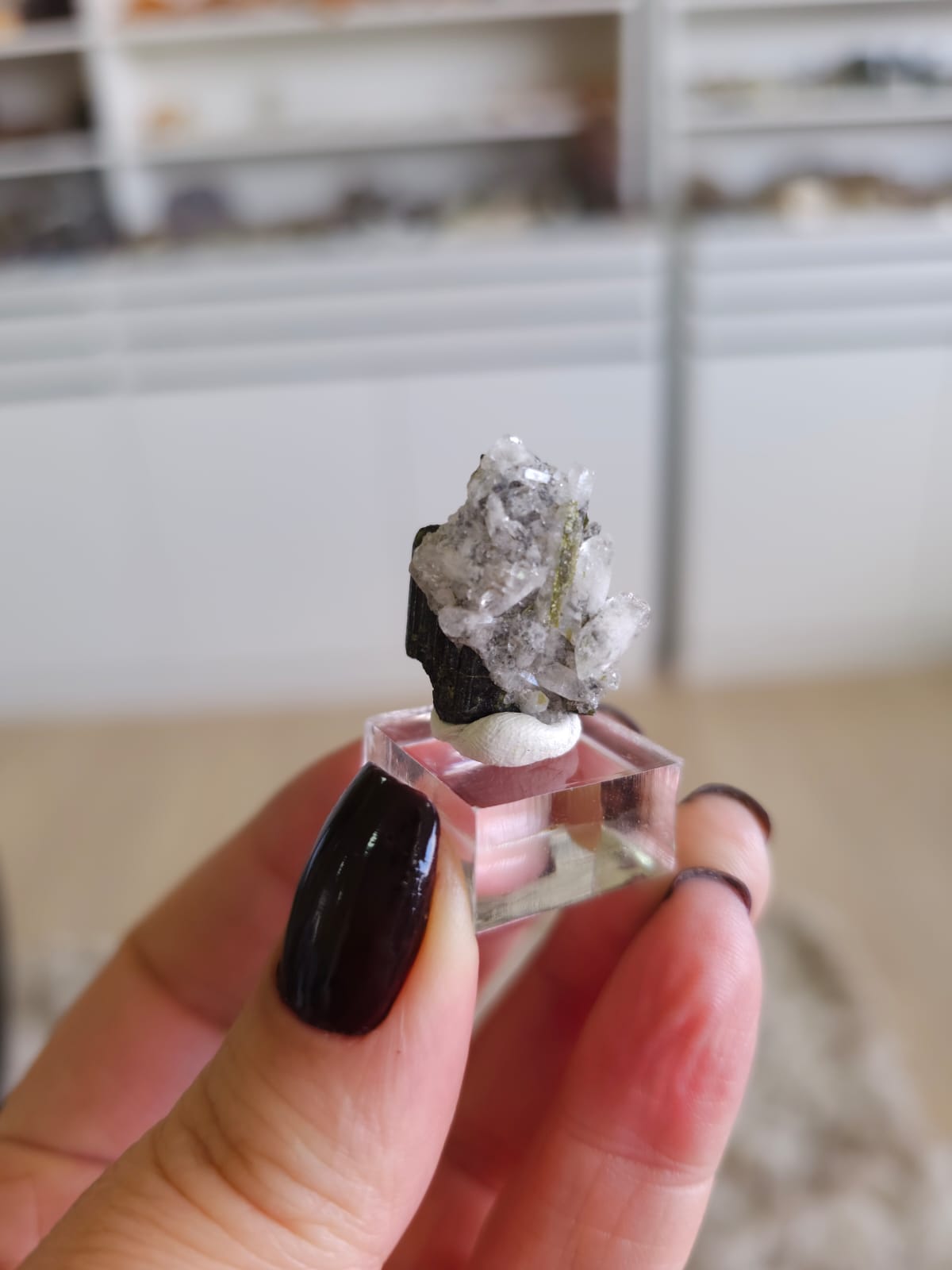 Nesta formação Epidoto está coberto de Quartzo em Drusa, nesta alquimia o Quartzo é um grande amplificador da energia do Epidoto, principalmente pelo fato de estar em Drusa ✨