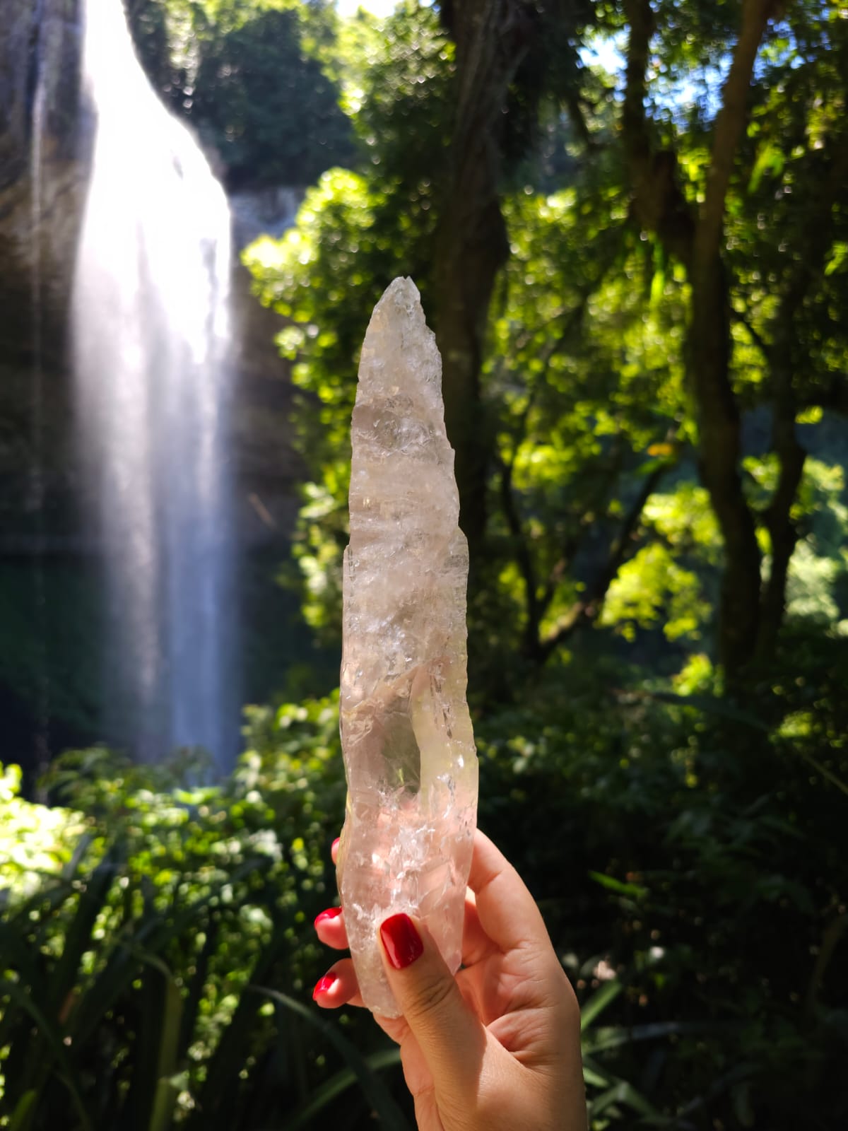 Um imenso Ser Cristalino de energia única, totalmente terminado naturalmente em seus 28 centímetros de altura, com marcas Lemurianas e uma imensa Janela da Alma em uma das suas terminações.