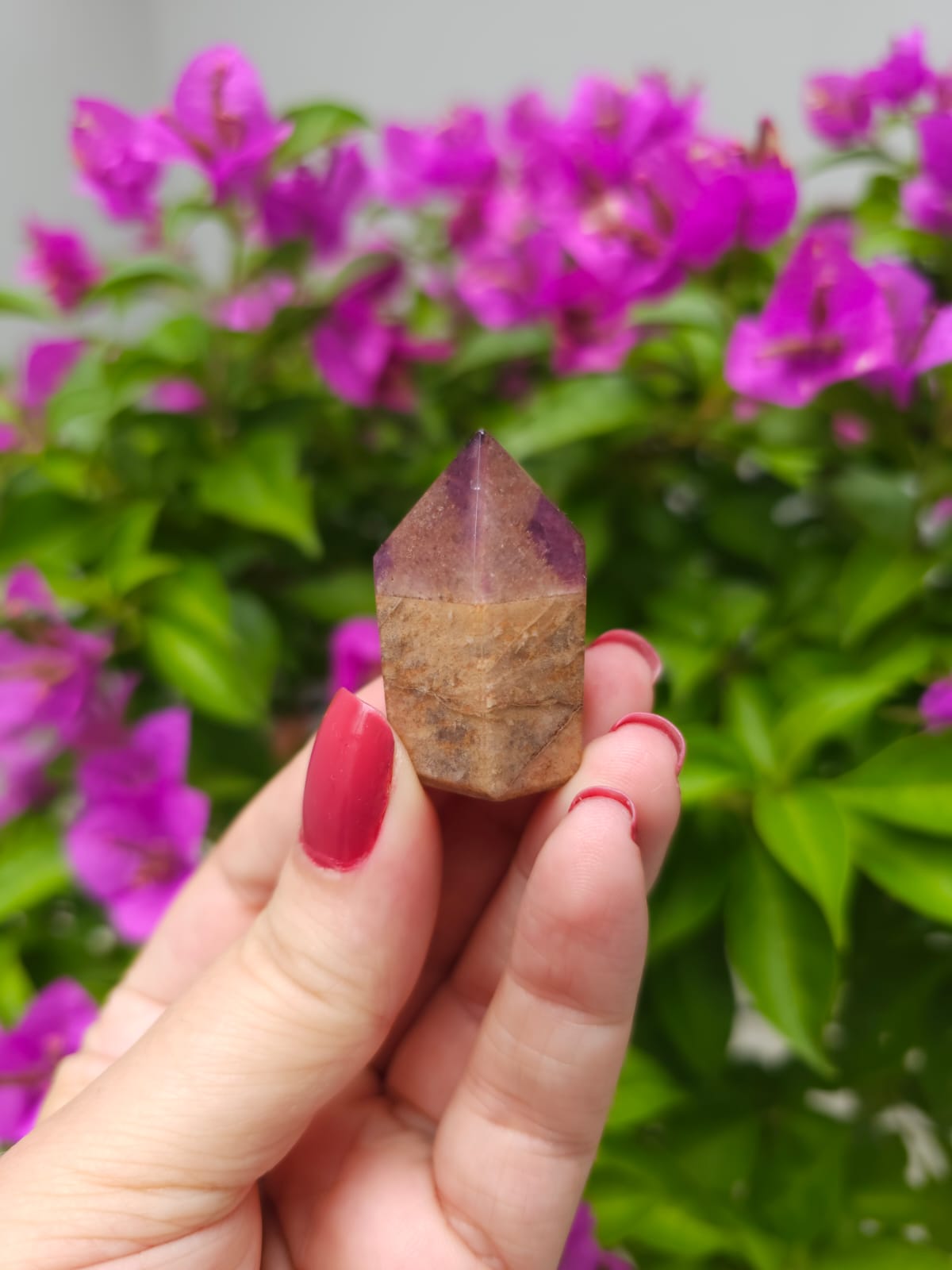 Uma mistura de cristais incluindo Fumê, Citrino e Quartzo Incolor, recebendo uma capa de Ametista gerando uma energia de altissima vibração.