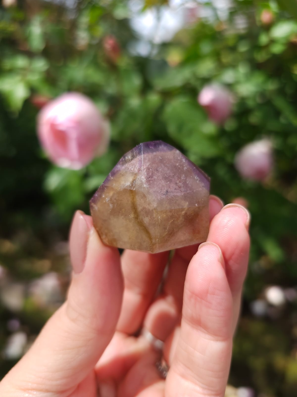 Uma mistura de cristais incluindo de forma alternada Fumê, Citrino e Quartzo Incolor, recebendo uma capa de Ametista gerando uma energia de altíssima vibração✨