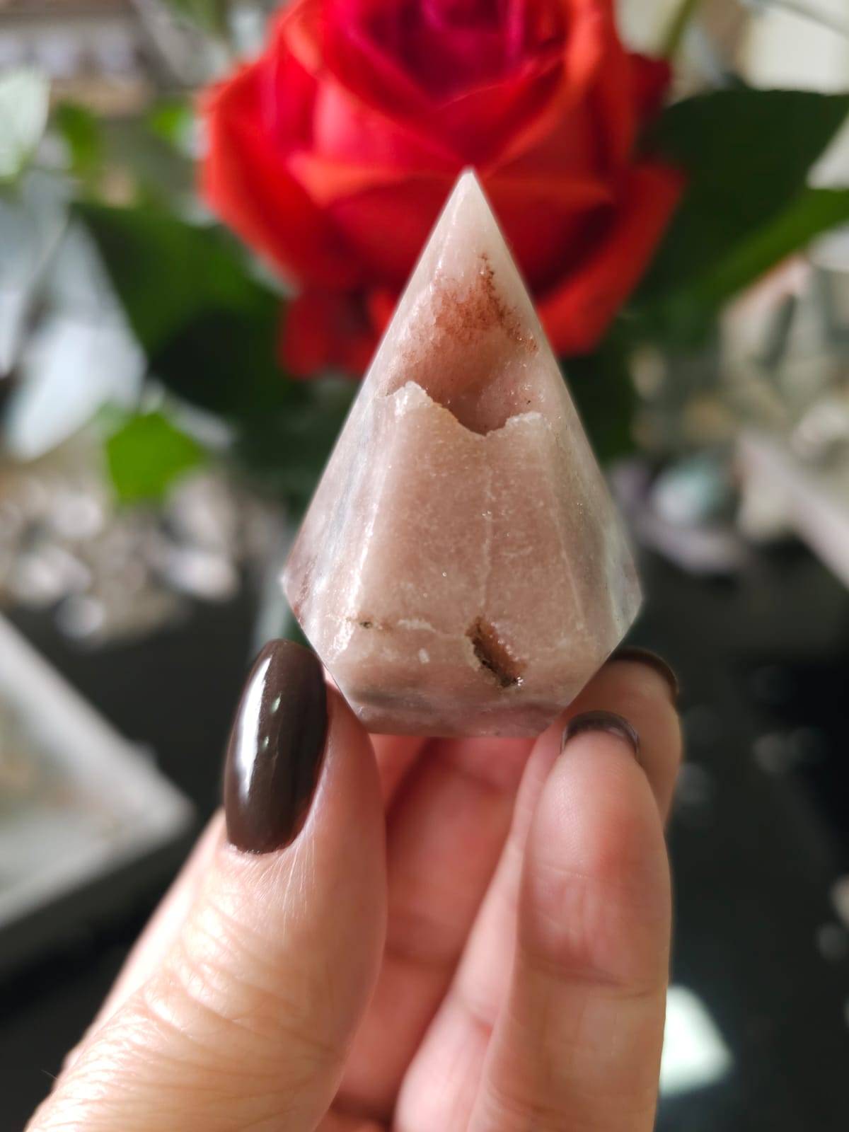 A Ametista Rosa vibra uma energia suave, acolhedora e feminina. Na alquimia desta lapidação em forma de lua, ressalta sua forma feminina acolhedora.