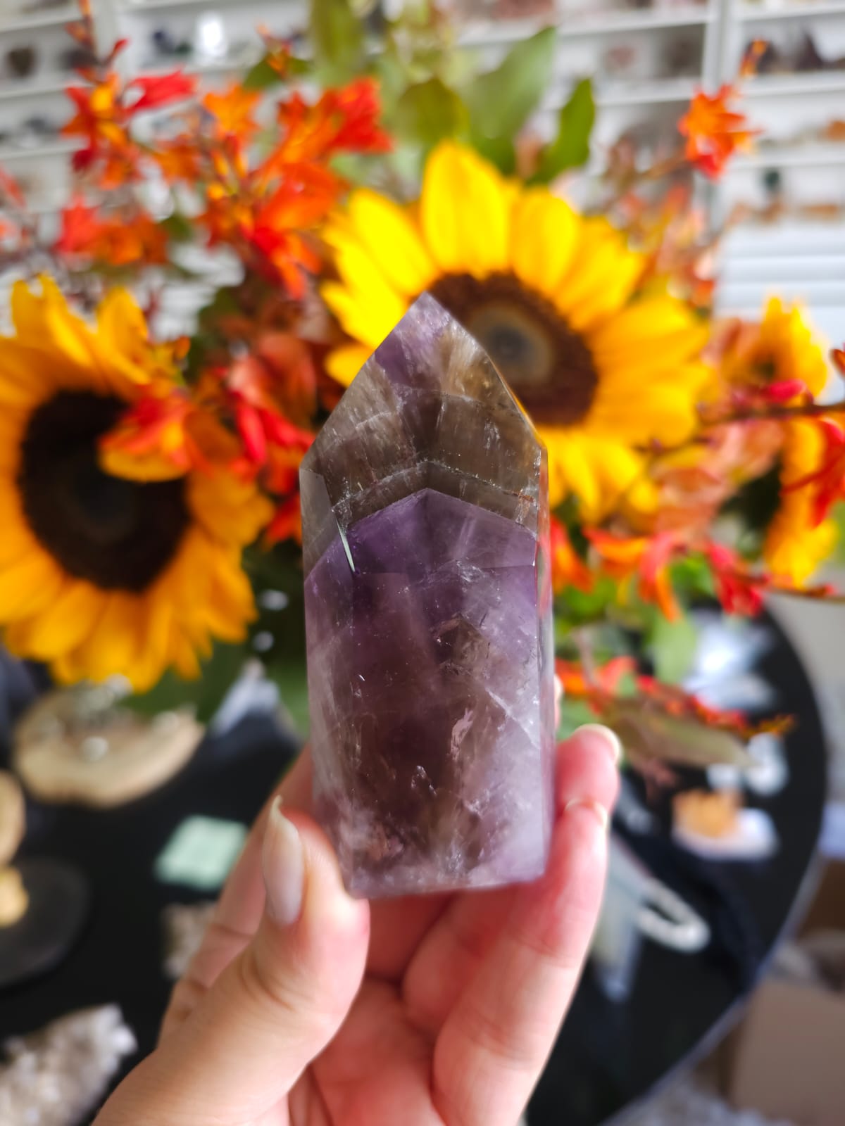 Ele possui as energias de até sete minerais, o que lhe confere um grande poder e uma altíssima vibração: Ametista, Quartzo Fumê, Quartzo com Rutilo, Goethita, Lepidocrocita, Quartzo e Cacoxenita são minerais que constumam compor essa formação✨