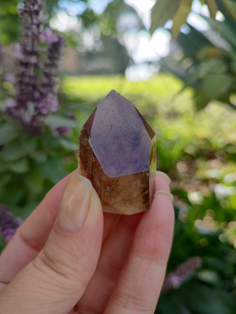 Uma mistura de cristais incluindo Fumê, Citrino e Quartzo Incolor, recebendo uma capa de Ametista gerando uma energia de altissima vibração.