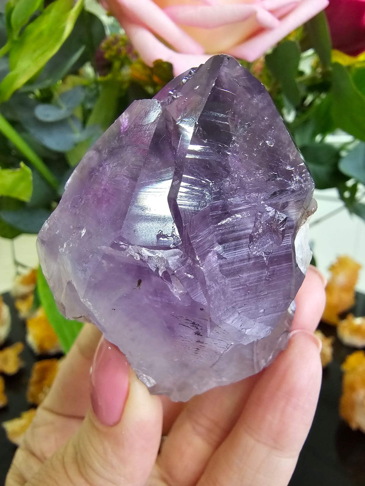 Pontas de Ametista em formação natural, sem lapidação e de tamanhos maiores são mais raras de encontrarmos, pois são encontradas apenas em Drusas muito grandes.