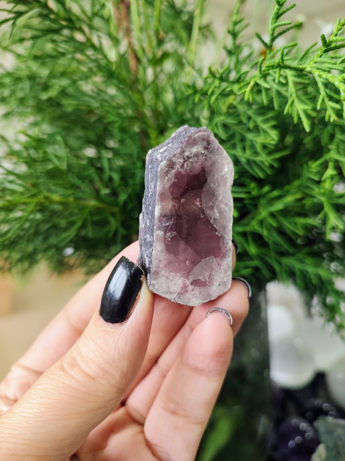 A Lepidolita apresenta a mistura do rosa (coração) com o roxo (mente).