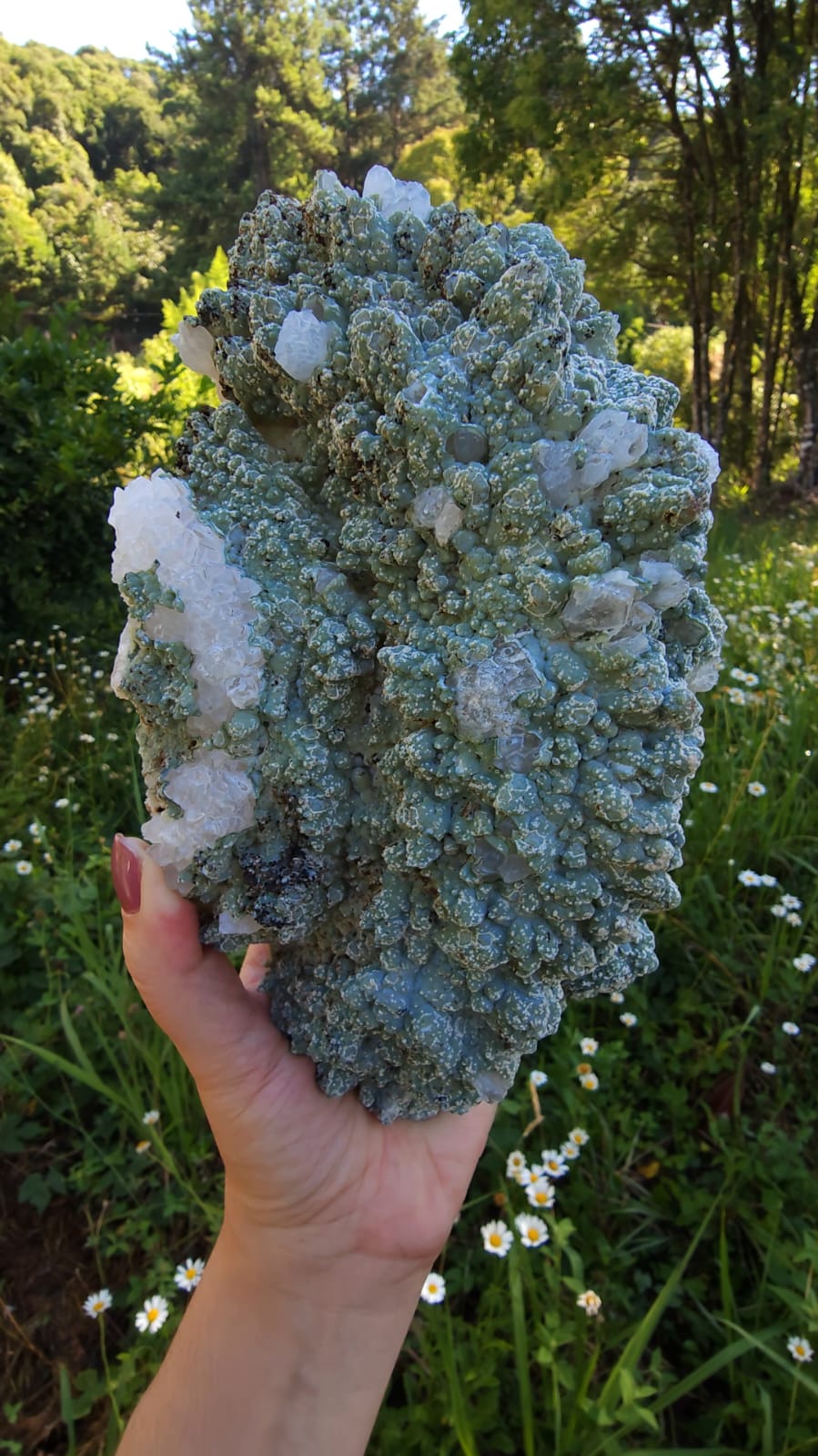 Nesta formação o mineral de Celadonita assentou sobre as pontas de cristais de Quartzo Transparentes, que amplificam todo o poder deste mineral ✨️