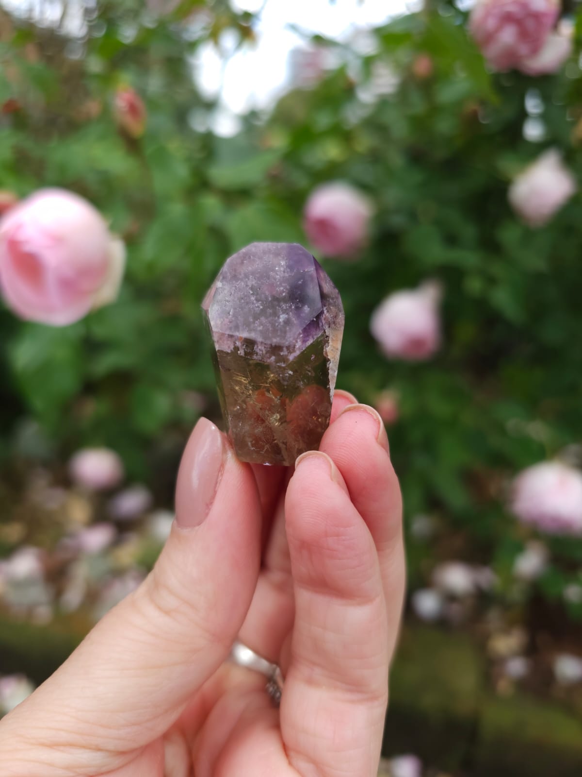 Uma mistura de cristais incluindo de forma alternada Fumê, Citrino e Quartzo Incolor, recebendo uma capa de Ametista gerando uma energia de altíssima vibração✨