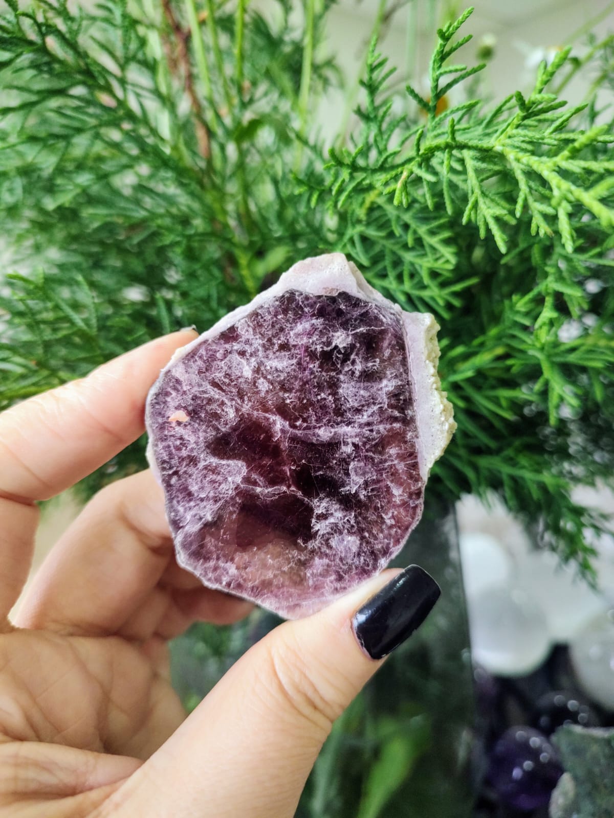 A Lepidolita apresenta a mistura do rosa (coração) com o roxo (mente).