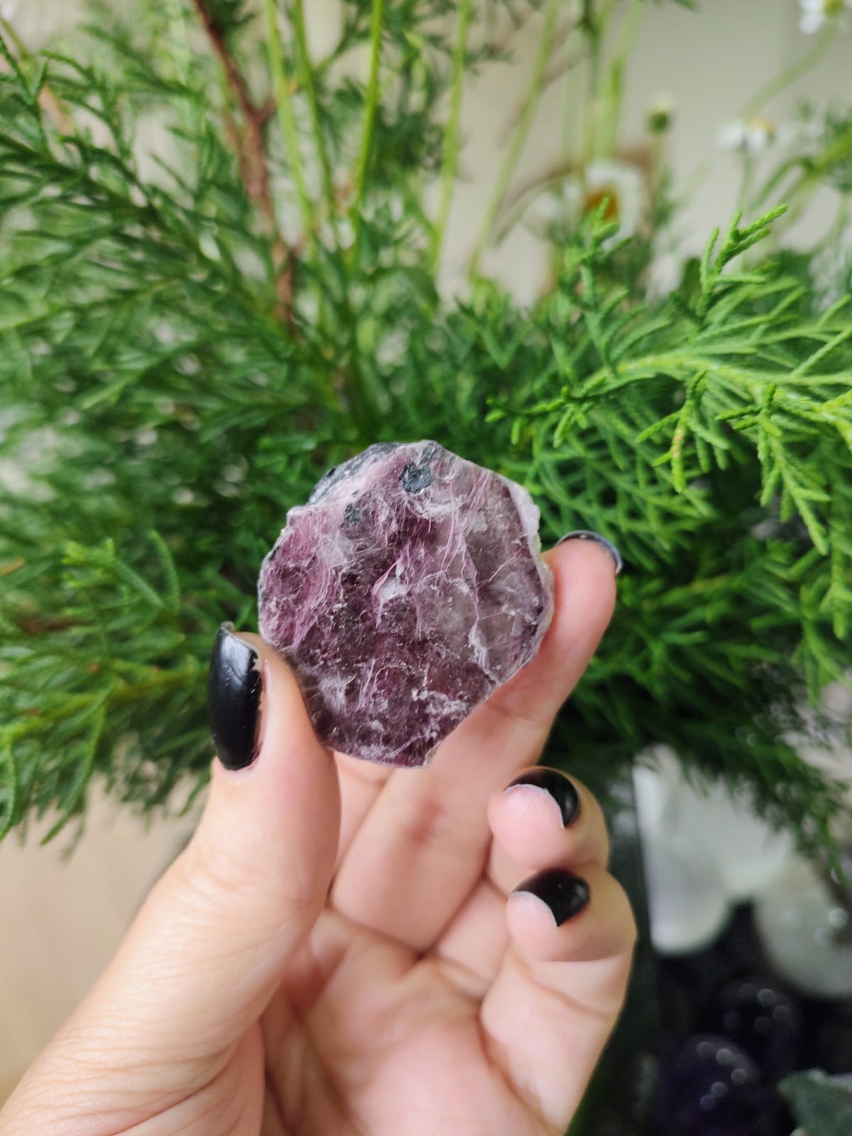 A Lepidolita apresenta a mistura do rosa (coração) com o roxo (mente).