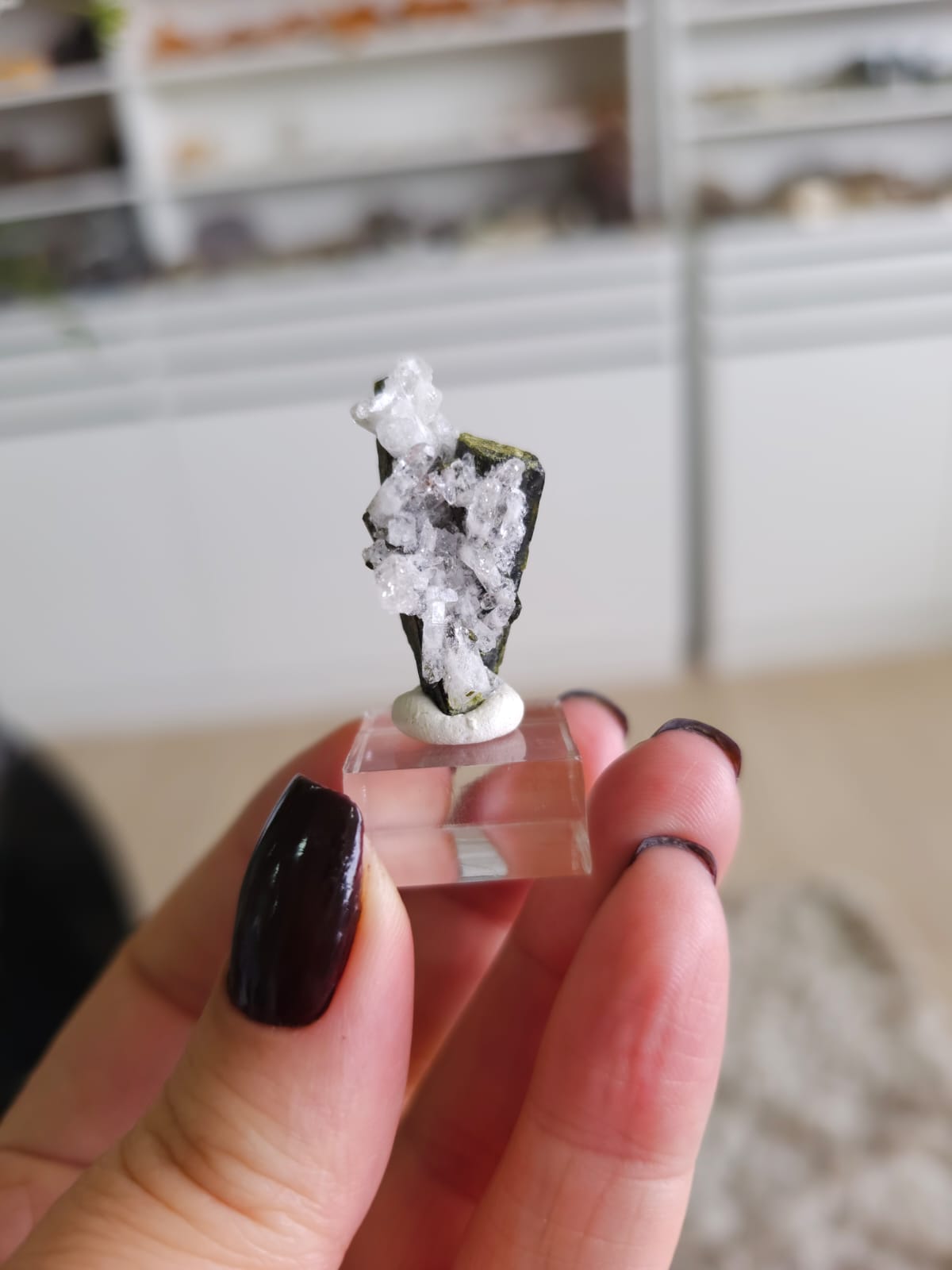 Nesta formação Epidoto está coberto de Quartzo em Drusa, nesta alquimia o Quartzo é um grande amplificador da energia do Epidoto, principalmente pelo fato de estar em Drusa ✨